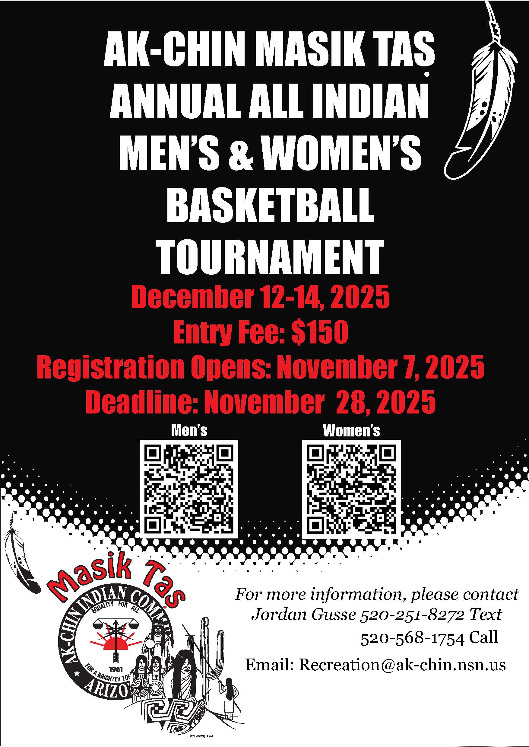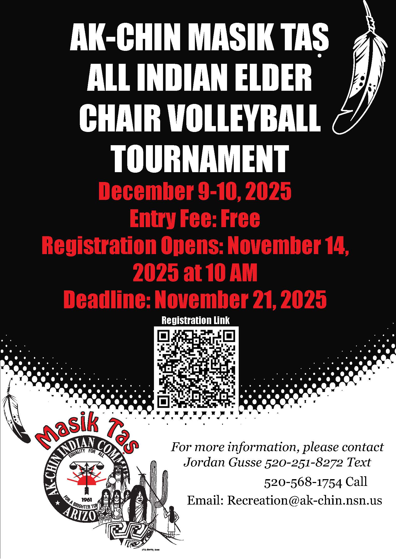 All Indian Elder Chair Volleyball and All Indian Men’s and Women’s Basketball Tournament take place at the Ak-Chin Recreation Gym located at 46753 W Farrell Rd., Maricopa, AZ 85139